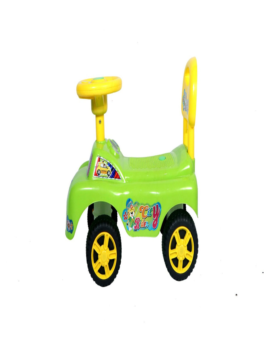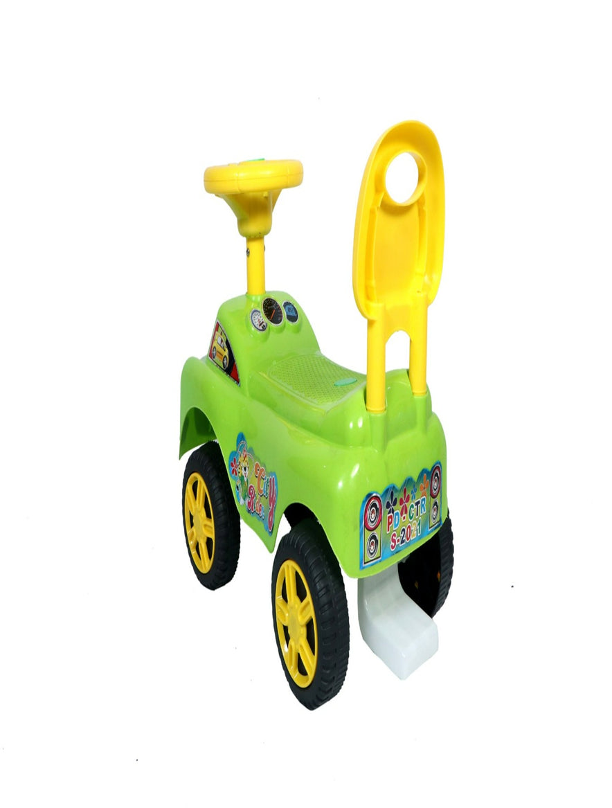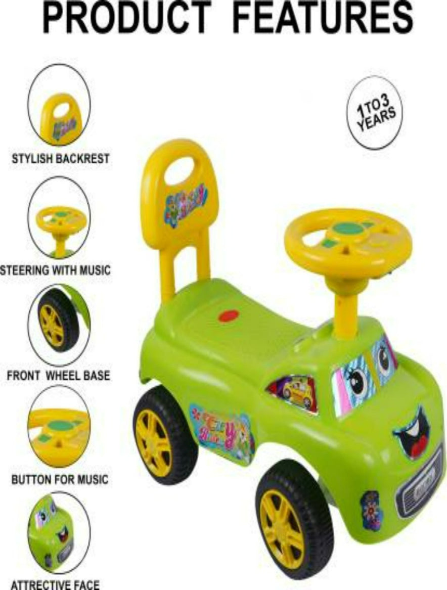 It helps your baby to develop gross motor skills in the most fun way This baby ride-on features a scooter with a multi-color headlight, horn and musical tunes, which keeps the baby indulged in active Play Under seat utility storage box allows baby to keep toys Four big and wide wheels add to the safety and comfort of the child It has a spacious seat with a safety backrest for better protection