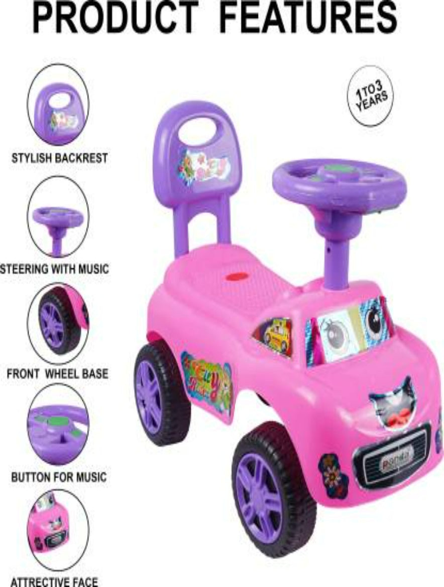 It helps your baby to develop gross motor skills in the most fun way This baby ride-on features a scooter with a multi-color headlight, horn and musical tunes, which keeps the baby indulged in active Play Under seat utility storage box allows baby to keep toys Four big and wide wheels add to the safety and comfort of the child It has a spacious seat with a safety backrest for better protection