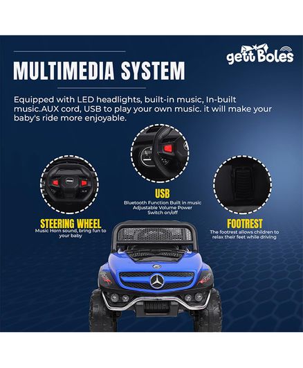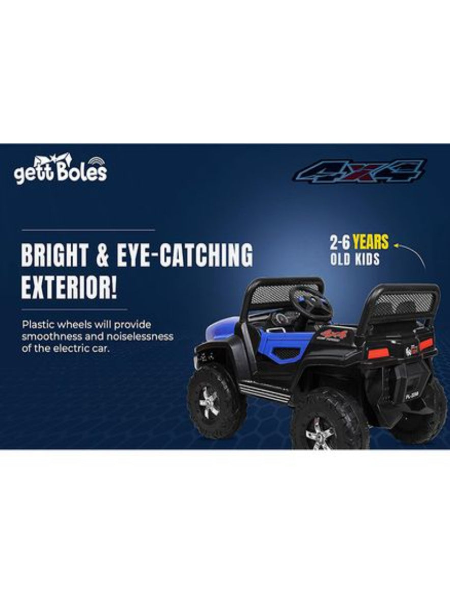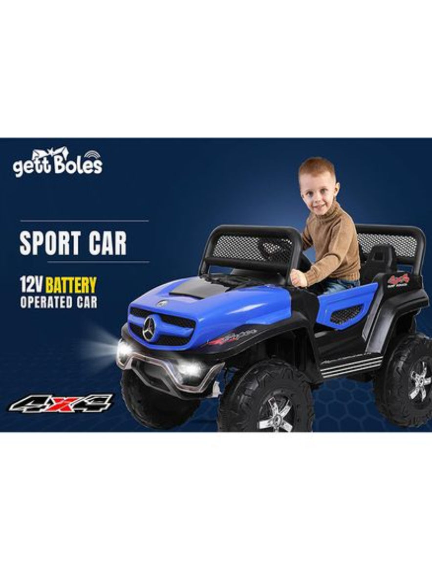 Battery operated ride on electric jeep for kids. This jeep can be operated manually and also with remote. Jeep comes with music system compatible with aux, pen drive and sd card. In their early years kid can sit in the jeep car and parents can control it through Bluetooth remote as kids grow they can ride it manually using foot accelerator. This jeep is operated with 2 batteries and 2 motors. Ride on jeep will run at a speed of 4-5km/hr. Kid will ride it on any flat surface. This jeep is made up of non toxic plastic and very safe for kids to drive.