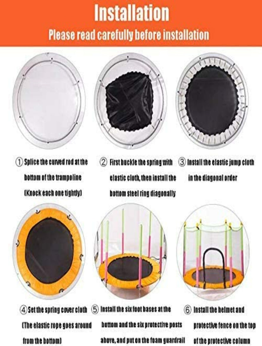 - 01 Spring Pulling Tool, 01 Spring Cover, 01 Jumping Mat, 36 Galvanized Steel Springs, 06 Arc Rods,06 Guardrail Buckle Caps, 06 Legs,06 Suction Leg Shoes, 12 Foam Safety Tubes, 01 Safety Enclosure Net, 06 Long Rods, Instruction Manual